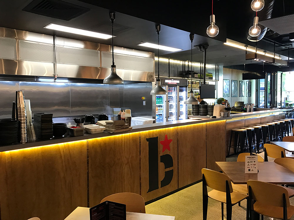 The fitout was fully inclusive providing the dining and bar area and the full service commercial kitchen at the back. Body Corporate Building requirements required out of the box thinking to provide the client with adequate mechanical ventilation in the kitchen area.